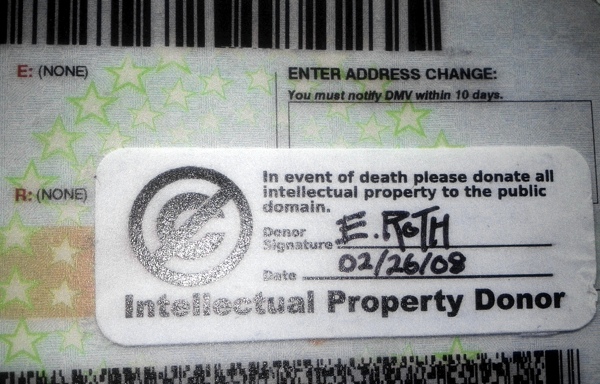 In der Schweiz wünschen viele Personen mittels Patientenverfügung oder Spendenkarte die Organspende im Fall ihres Todes. Ähnlich könnte man seine eigenen Immaterialgüterrechte beziehungsweise sein «geistiges Eigentum» (Intellectual Property, IP) spätestens im Fall seines Todes an die Allgemeinheit «spenden» – so wie es beispielsweise der Amerikaner Evan Roth mit einem entsprechenden Kleber auf seinem Führerausweis zugunsten der «Public Domain» versucht [Hinweis: Einige Weblinks entfernt, da leider nicht mehr gültig]: