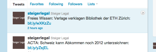 In eigener Sache: Verschiedene Leser haben mich gebeten, neue Inhalte auf meiner «Steiger Legal»-Website ergänzend zum bestehenden RSS-Feed auch bei Twitter zu vermelden. Gerne komme ich diesem Wunsch nach und veröffentliche nun unter @steigerlegal neue Inhalte jeweils mit Titel und URL. Die Veröffentlichung erfolgt automatisch via ifttt, persönlich twittere ich weiterhin unter @martinsteiger.