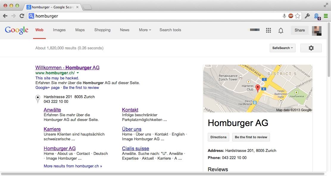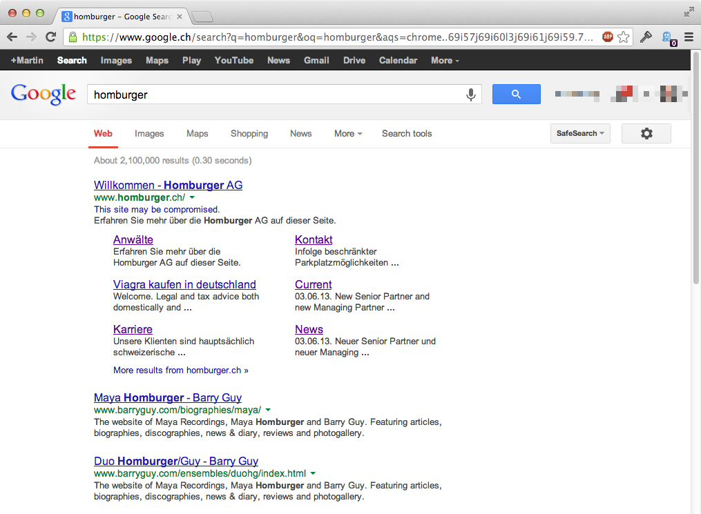Inzwischen werben die Anwaltskollegen auch noch für das Potenzmittel Levitra und Google zeigt nun «Diese Website wurde möglicherweise manipuliert» als Warnung an: