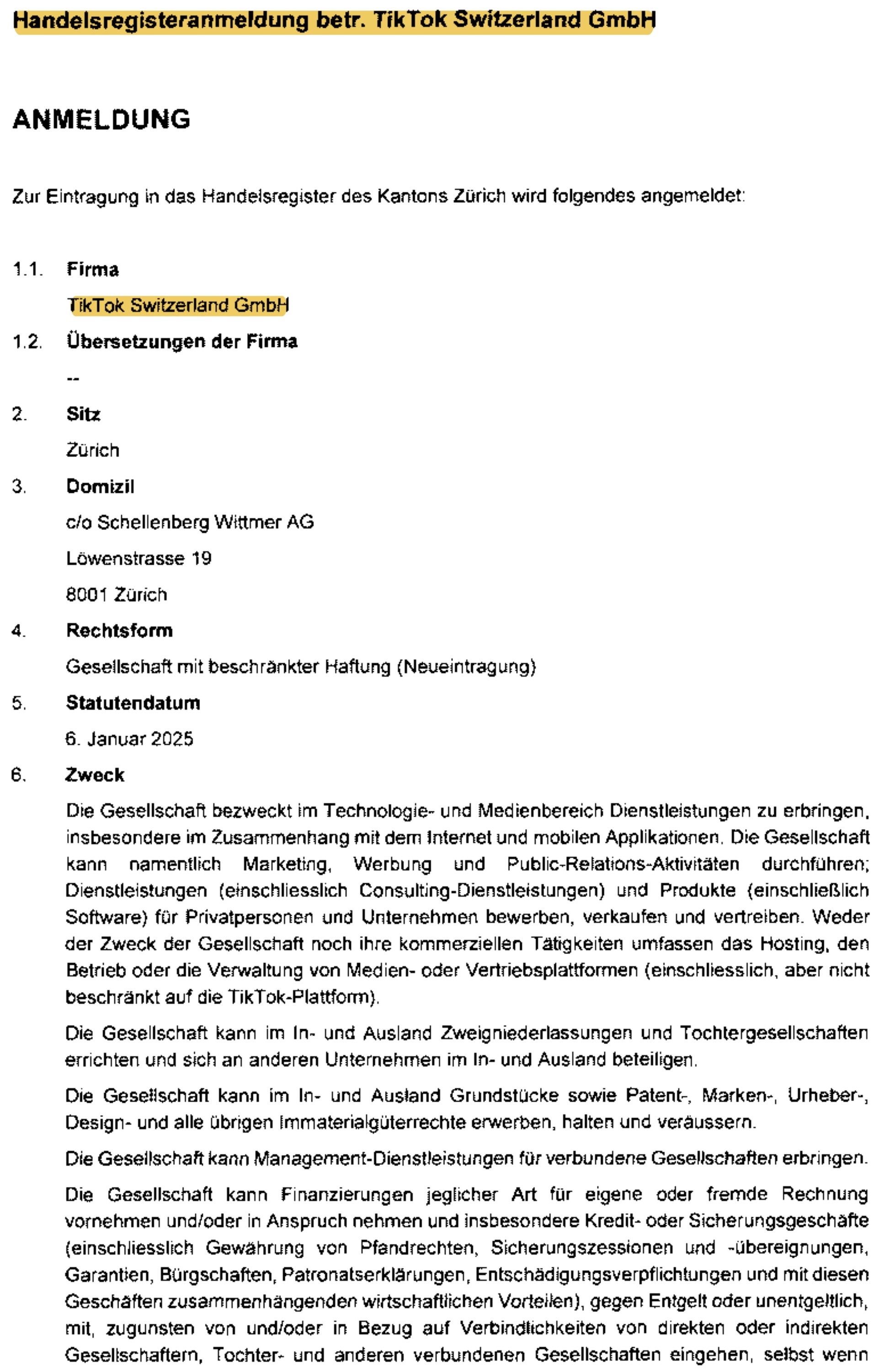 Die TikTok Switzerland GmbH wurde am 21. Januar 2025 gegründet, wie ein Blick in das Handelsregister des Kantons Zürich zeigt.