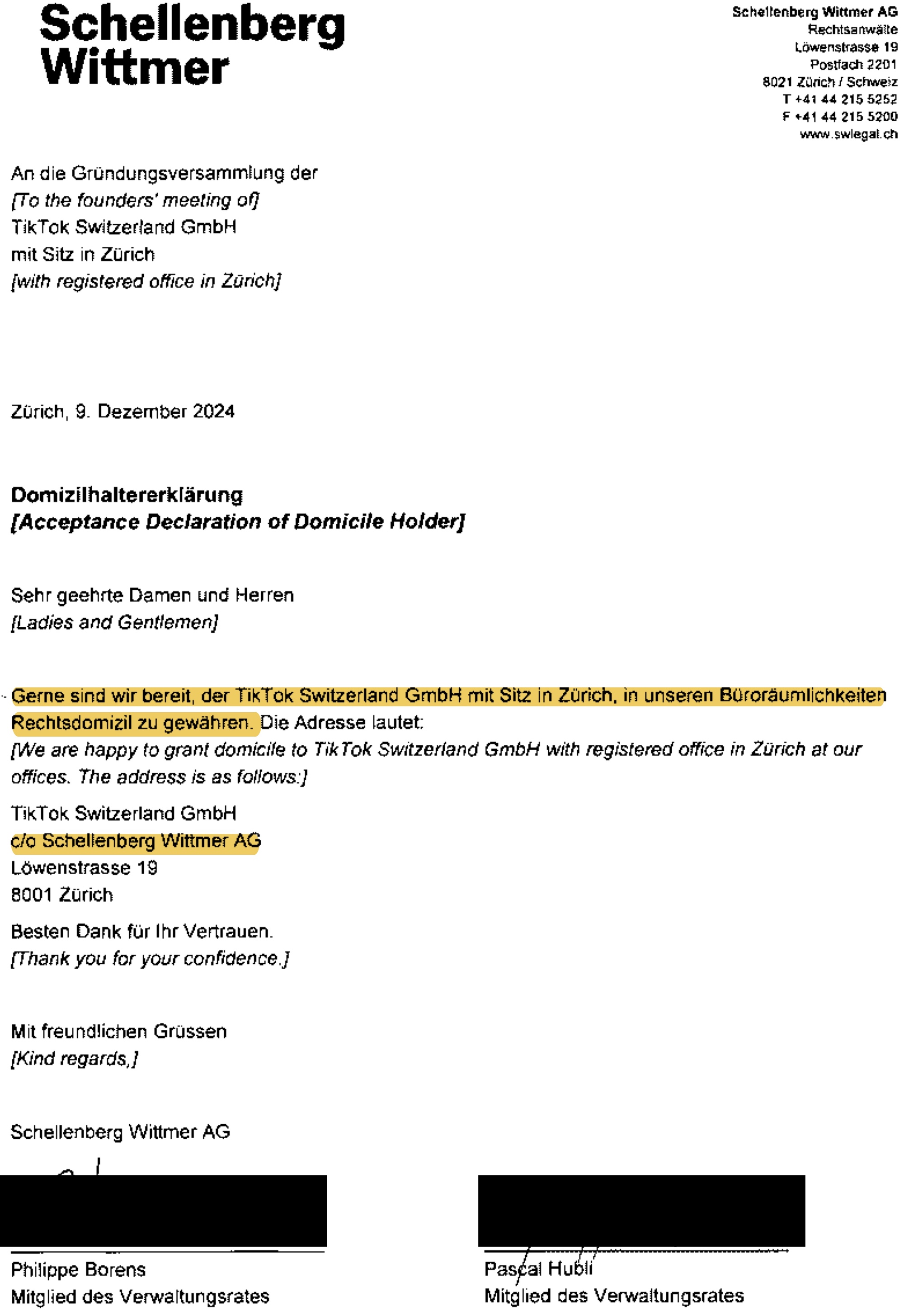 Der Sitz der GmbH befindet sich bei den Anwaltskollegen von Schellenberg Wittmer in Zürich. Die Anwaltskanzlei gewährt der TikTok Switzerland GmbH das Domizil.