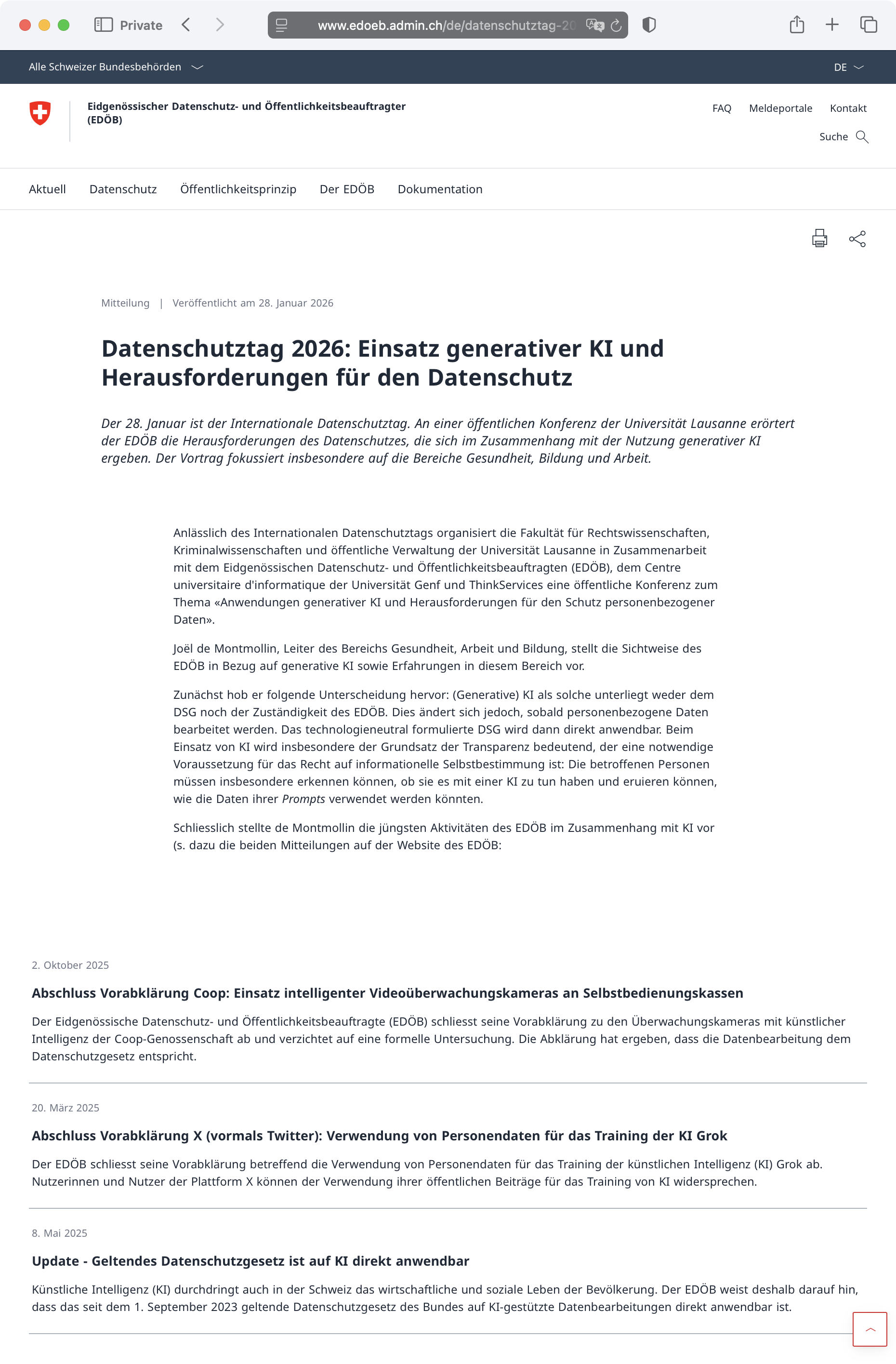 Gemäss der kurzen Mitteilung vom 28. Januar 2026 stellte Joël de Montmollin, Bereichsleiter für Arbeit, Bildung und Gesundheit beim EDÖB, an einer Konferenz in Lausanne die «Sichtweise des EDÖB in Bezug auf generative KI sowie Erfahrungen in diesem Bereich» vor.
