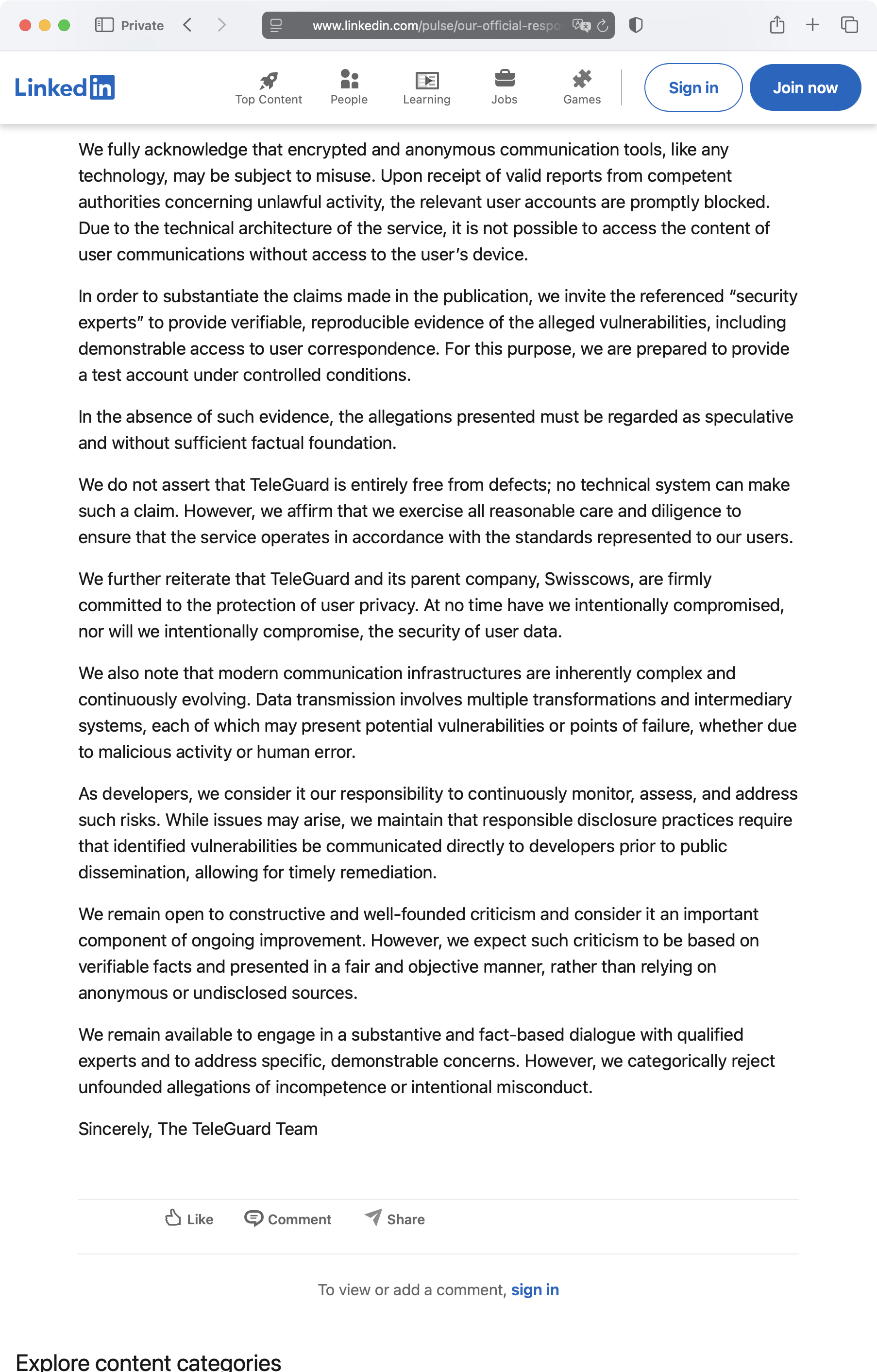 Die Stellungnahme geht ferner auf mehrere konkrete Kritikpunkte – etwa einen möglichen API-Zugriff auf Schlüsselmaterial, die Ableitbarkeit aus Netzwerkverkehr oder den Umgang mit Metadaten – nicht technisch nachvollziehbar ein. Stattdessen dominieren rhetorische Elemente wie Angriffe auf die Quelle, allgemeine Hinweise auf die Komplexität moderner Systeme oder der Verweis darauf, dass kein System fehlerfrei sei. Gleichzeitig wird die Beweislast implizit auf die Kritiker verschoben, obwohl angesichts der weitreichenden Sicherheitsversprechen des Produkts (‹Ende-zu-Ende-Verschlüsselung›, ‹keine Metadaten›, maximale Privatsphäre) eine transparente und überprüfbare Darlegung durch den Anbieter selbst zu erwarten wäre.
