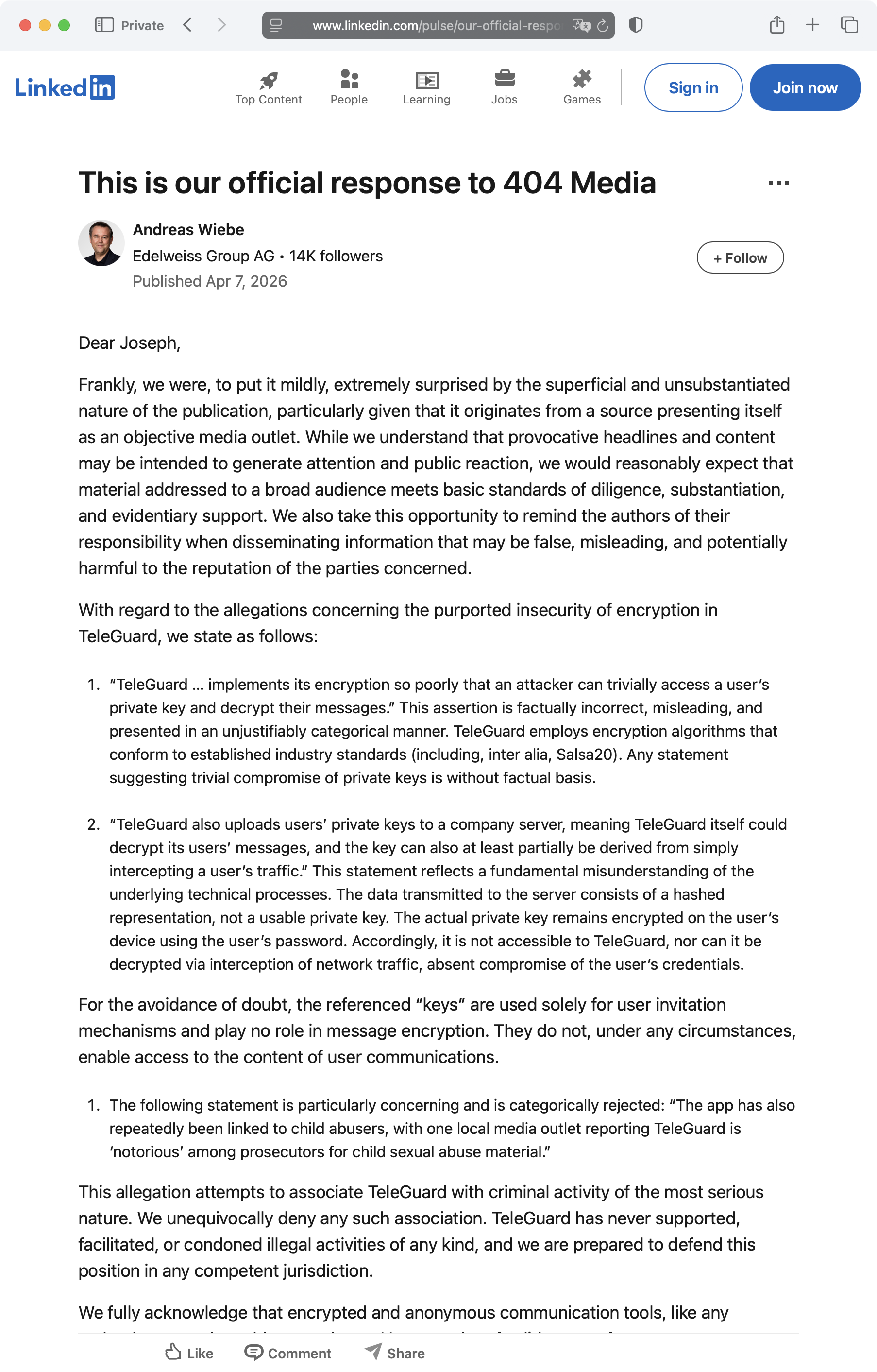 Ebenfalls bei LinkedIn veröffentlichte Andreas Wiebe am 7. April 2026 eine ausführliche Stellungnahme zu Händen von «404 Media»: