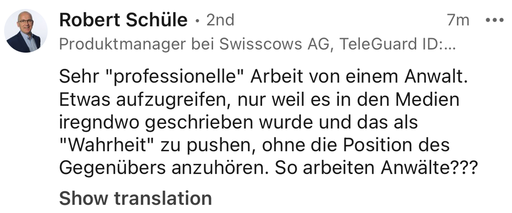 «Sehr ‹professionelle› Arbeit von einem Anwalt. Etwas aufzugreifen, nur weil es in den Medien irgendwo geschrieben wurde und das als ‹Wahrheit› zu pushen, ohne die Position des Gegegenübers anzuhören. So arbeiten Anwälte???»