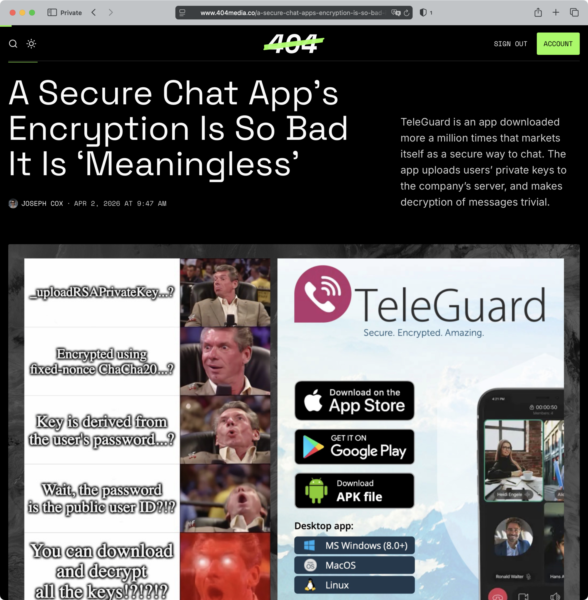 Die mangelhaft-nutzlose Verschlüsselung beim Messenger TeleGuard fasst «404 Media» in einem aktuellen Beitrag wie folgt zusammen (in deutscher Übersetzung):