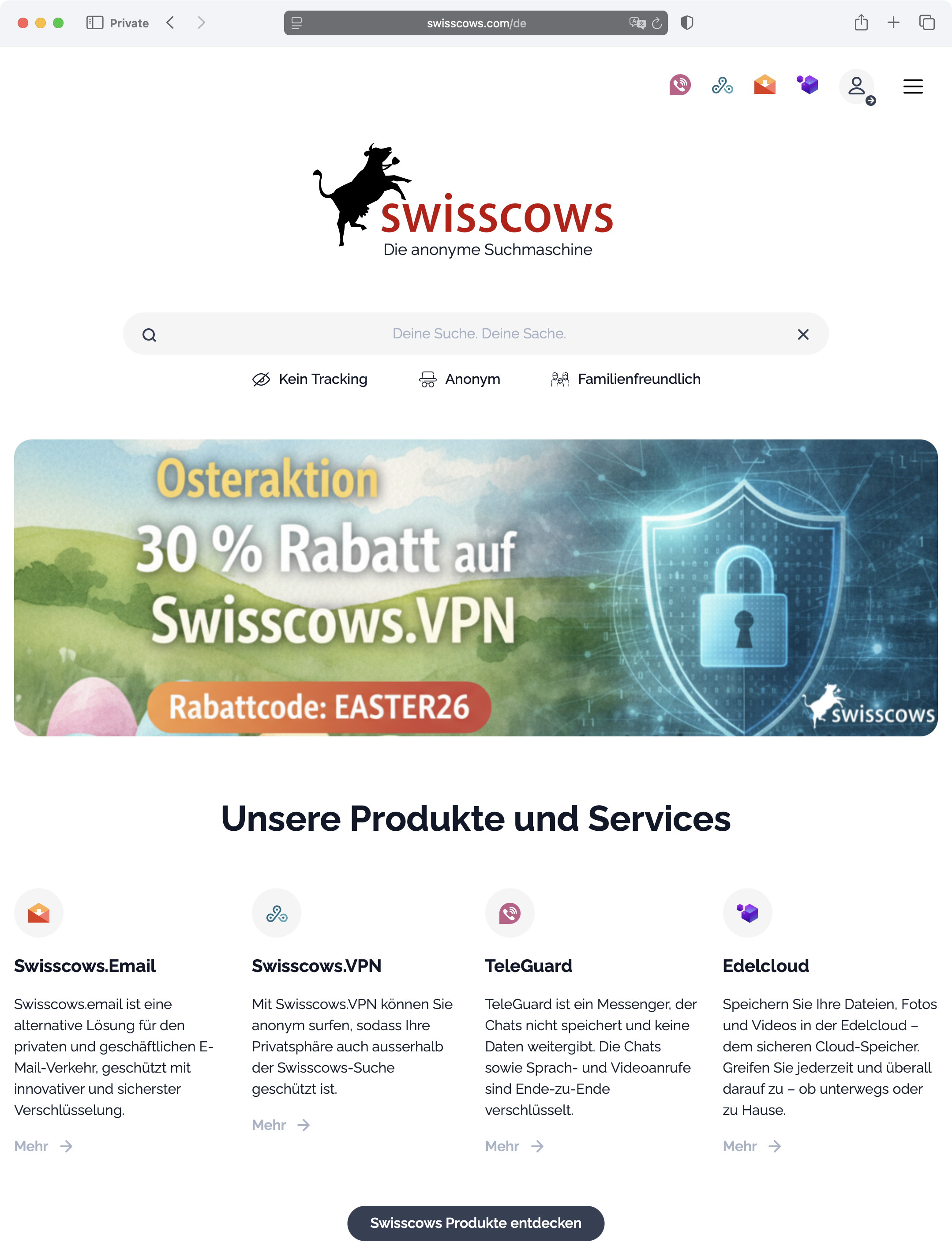 Das Angebot von Swisscows umfasst auch Dienste für «sicheren Cloud-Speicher», E‑Mail mit «innovativer und sicherster Verschlüsselung» und VPN mit «maximaler Sicherheit» sowie eine «anonyme Suchmaschine».