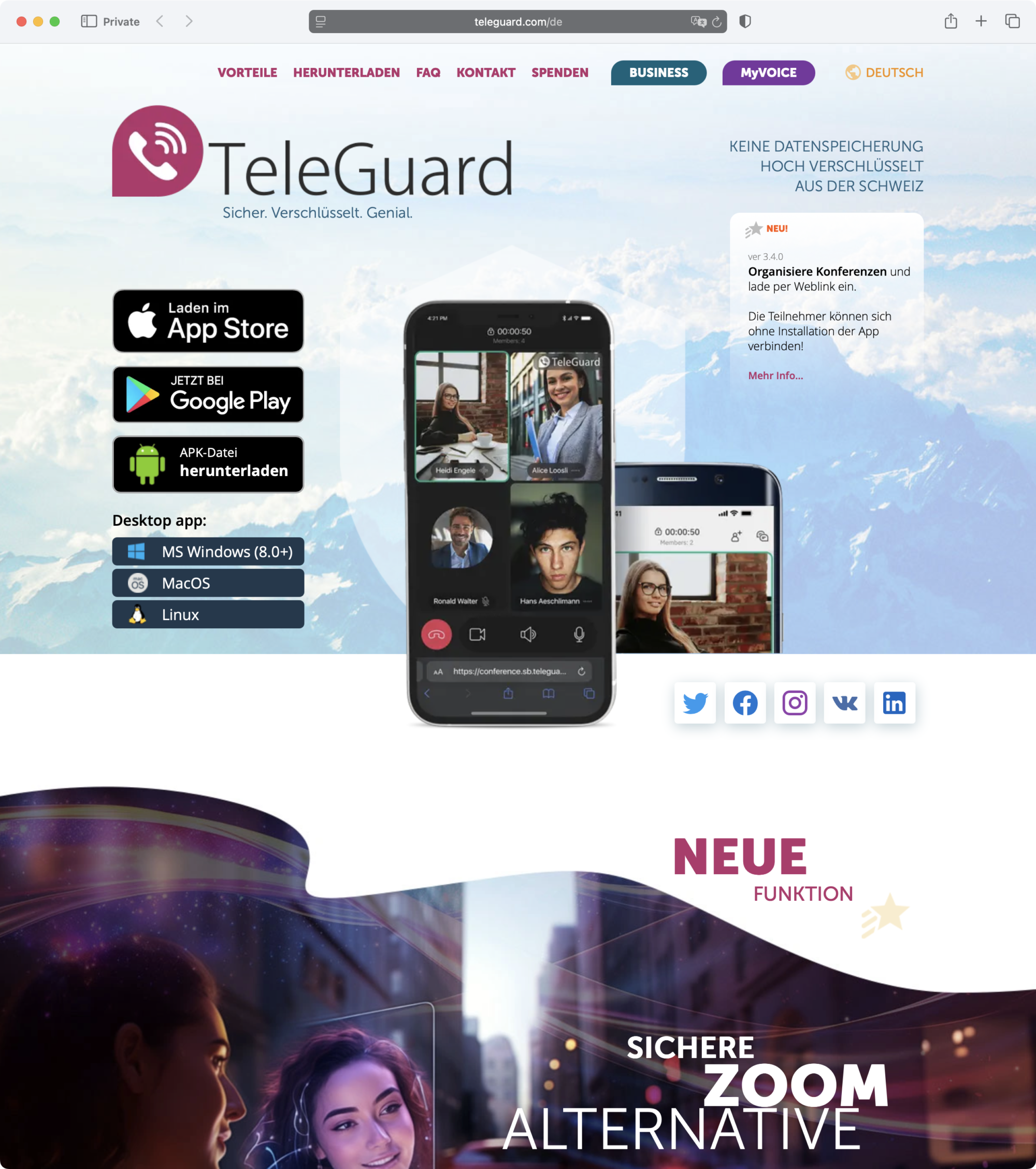 Swisscows bewirbt den Messenger TeleGuard unter anderem als «sichere Zoom-Alternative», mit «maximaler Sicherheit bei Videokonferenzen» und als den «privatesten Messenger der Welt».